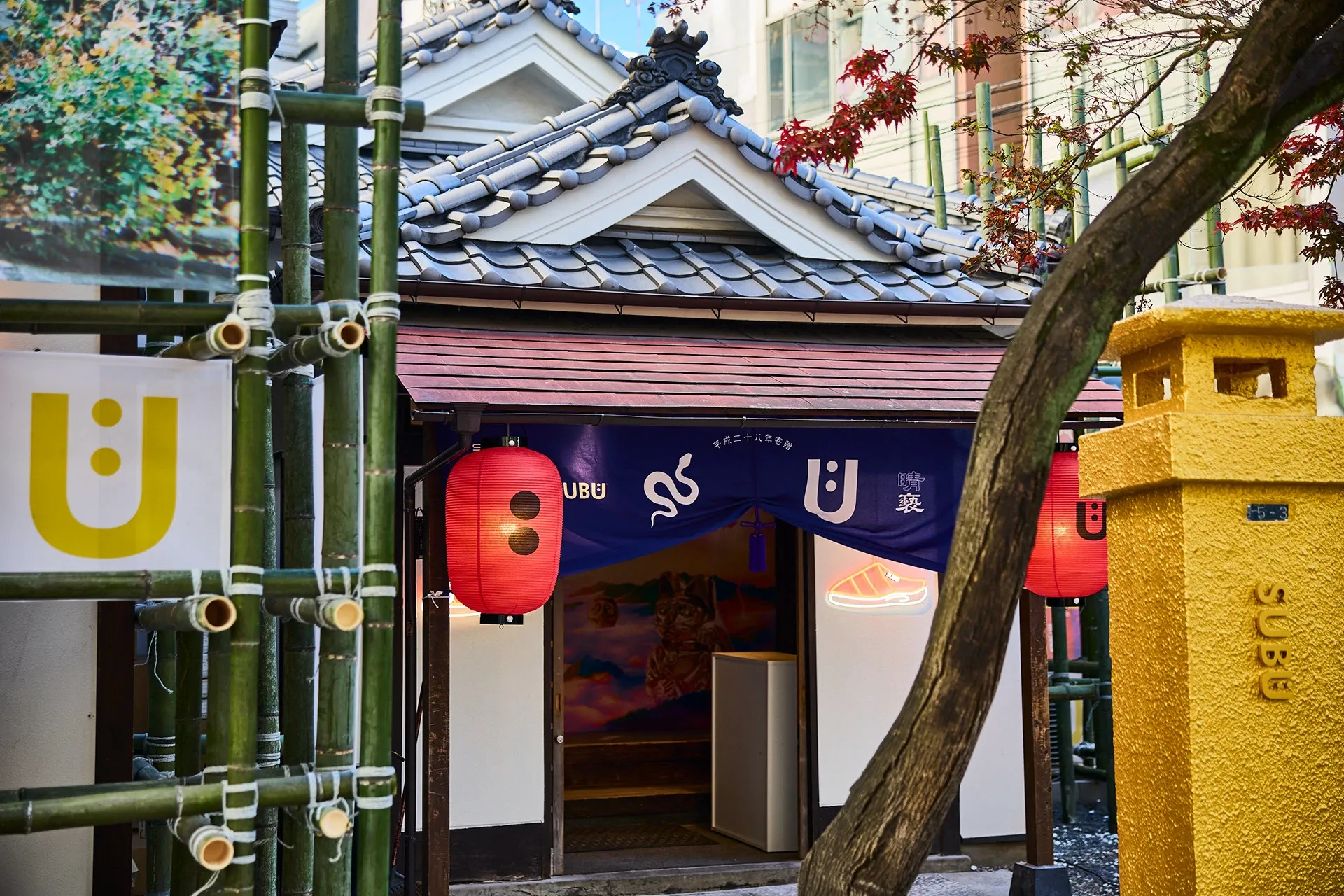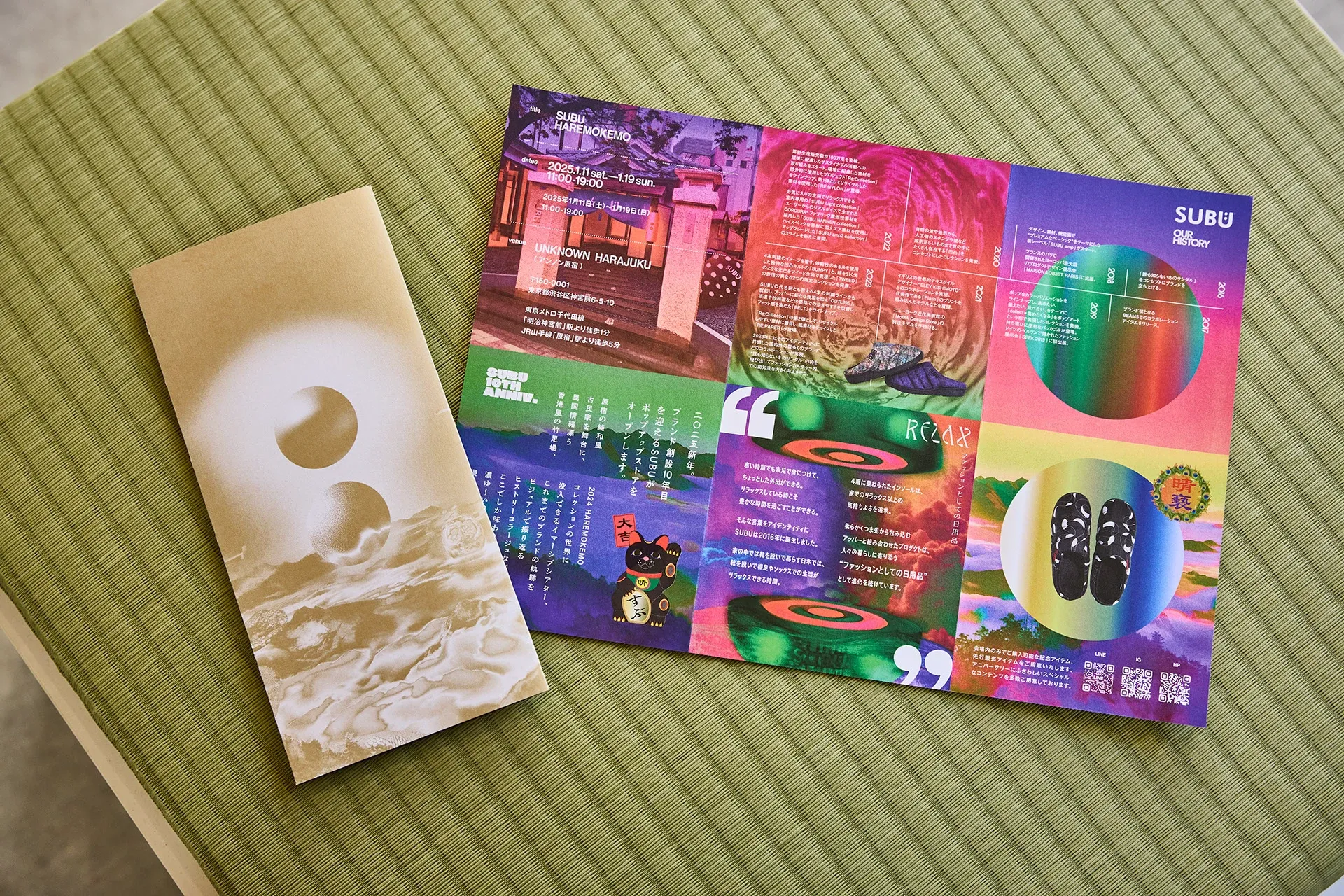 The pop-up fully embodies the world of SUBU, featuring a collage-style history exhibit created by director Toshihiko Fukukawa and a shop offering over 70 product types.