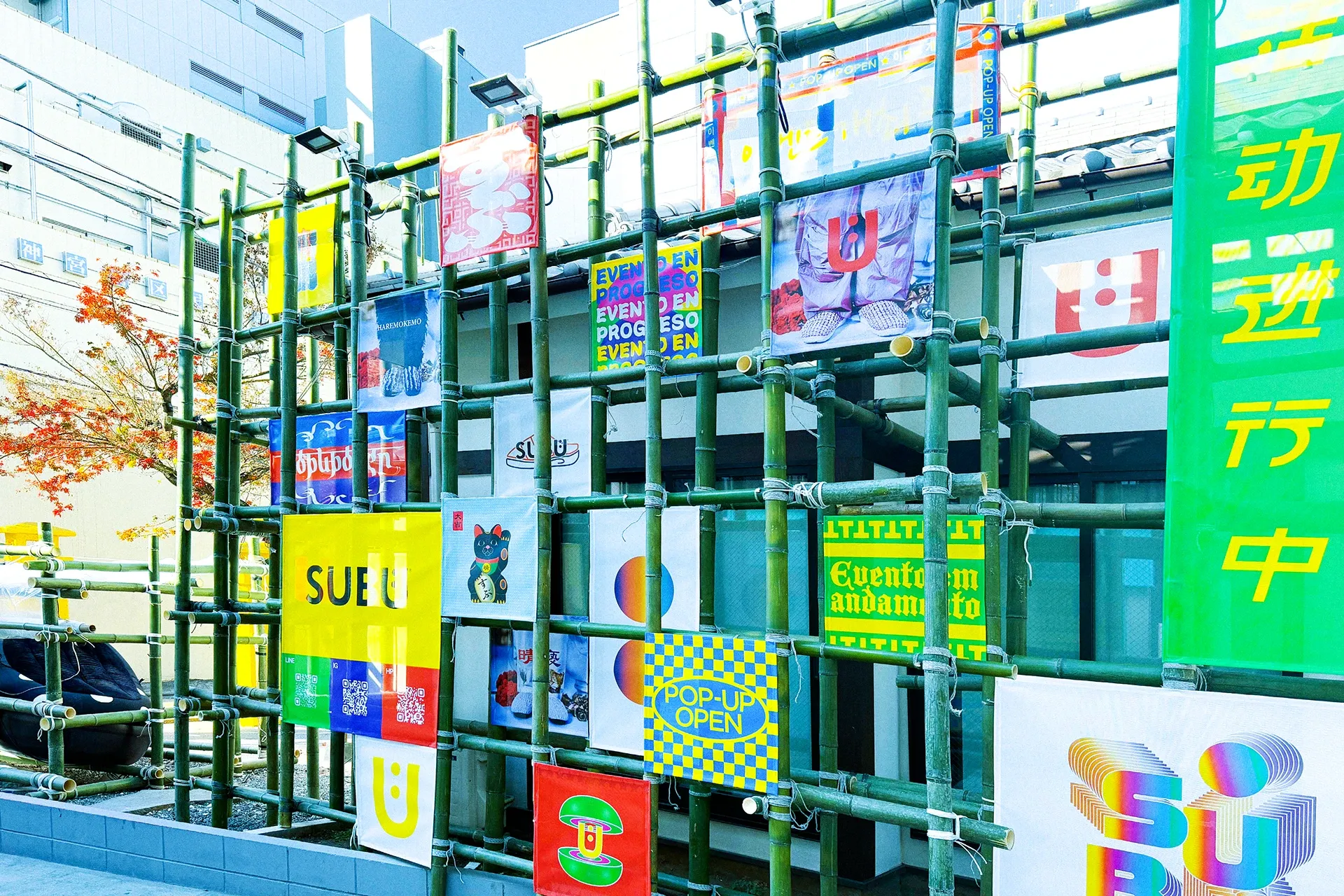 純和風古民家(UNKNOWN)の外観は、竹のクラフトアーティストCHIKAKENの手により香港の竹足場を再現、 床の間には“HAREMOKEMO”の世界に没入できるイマーシブシアターを常設した。