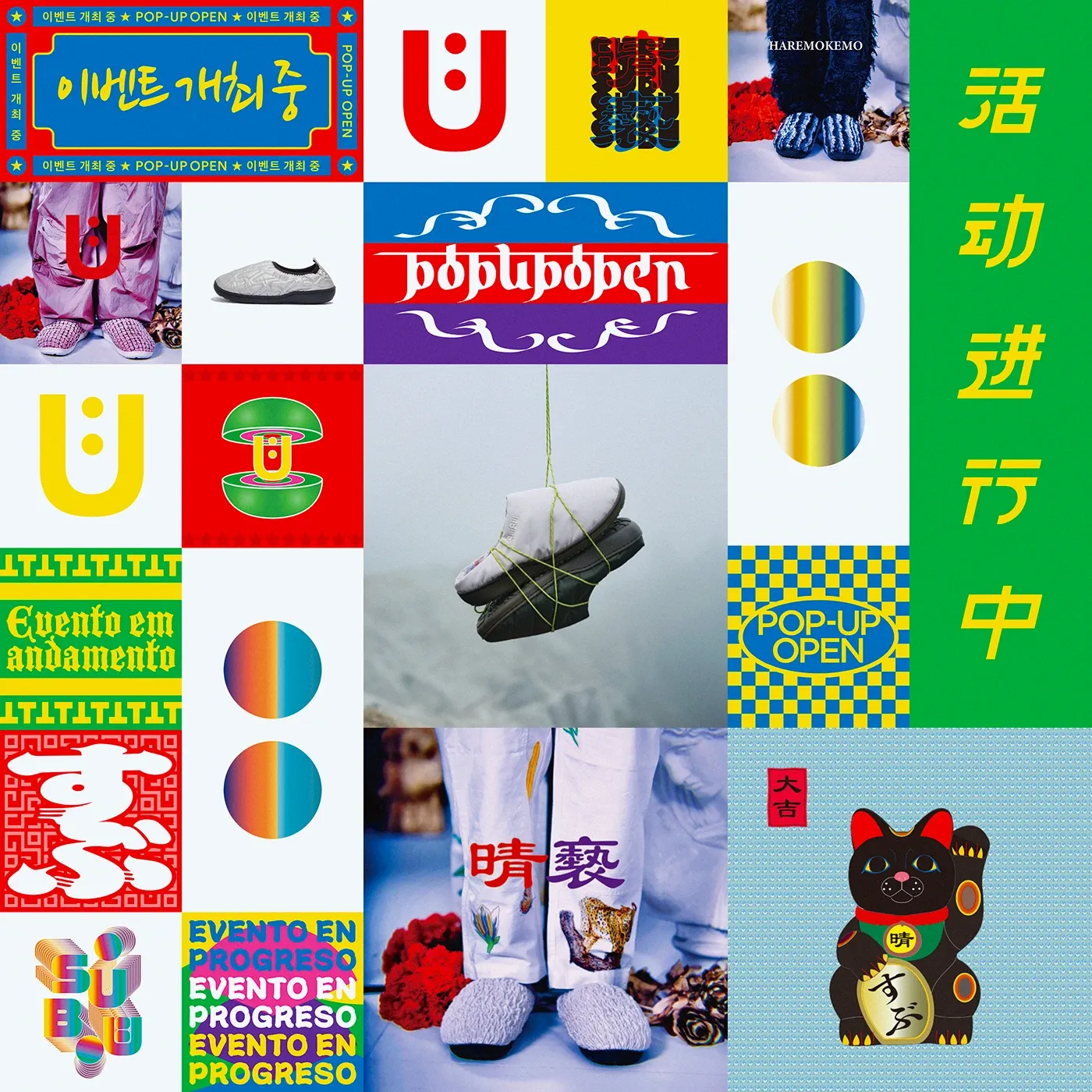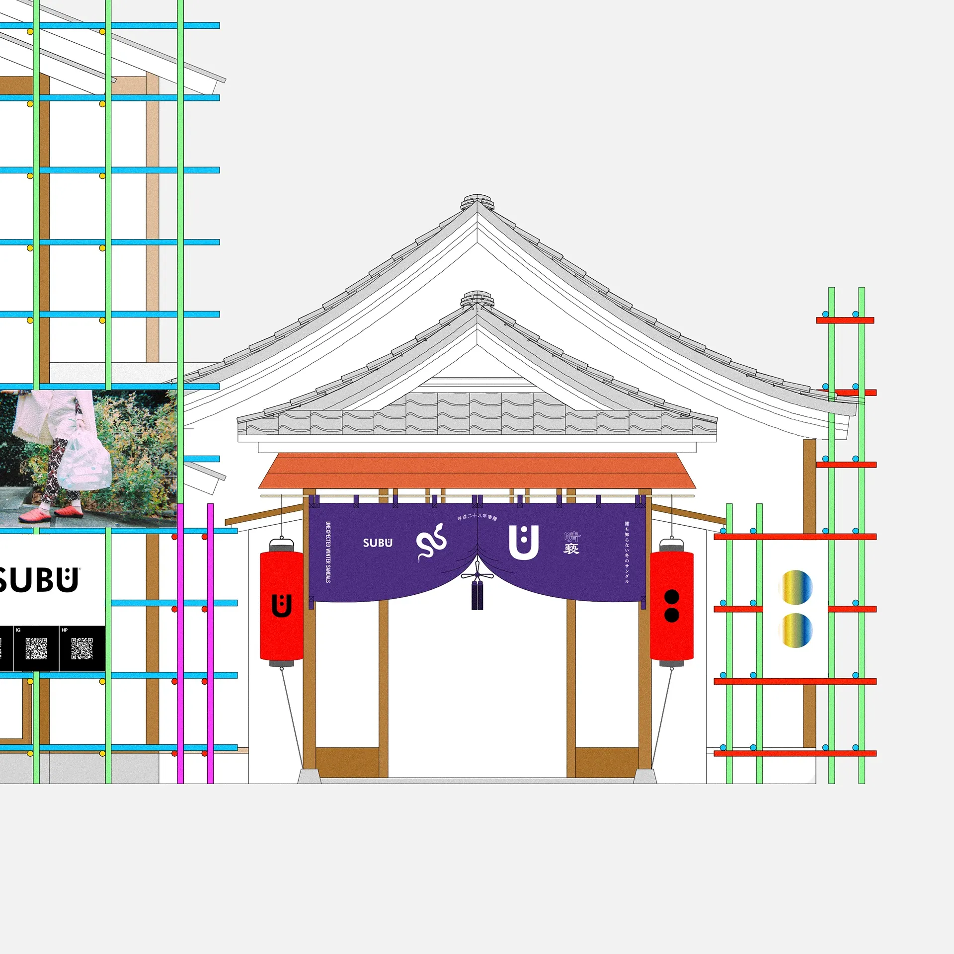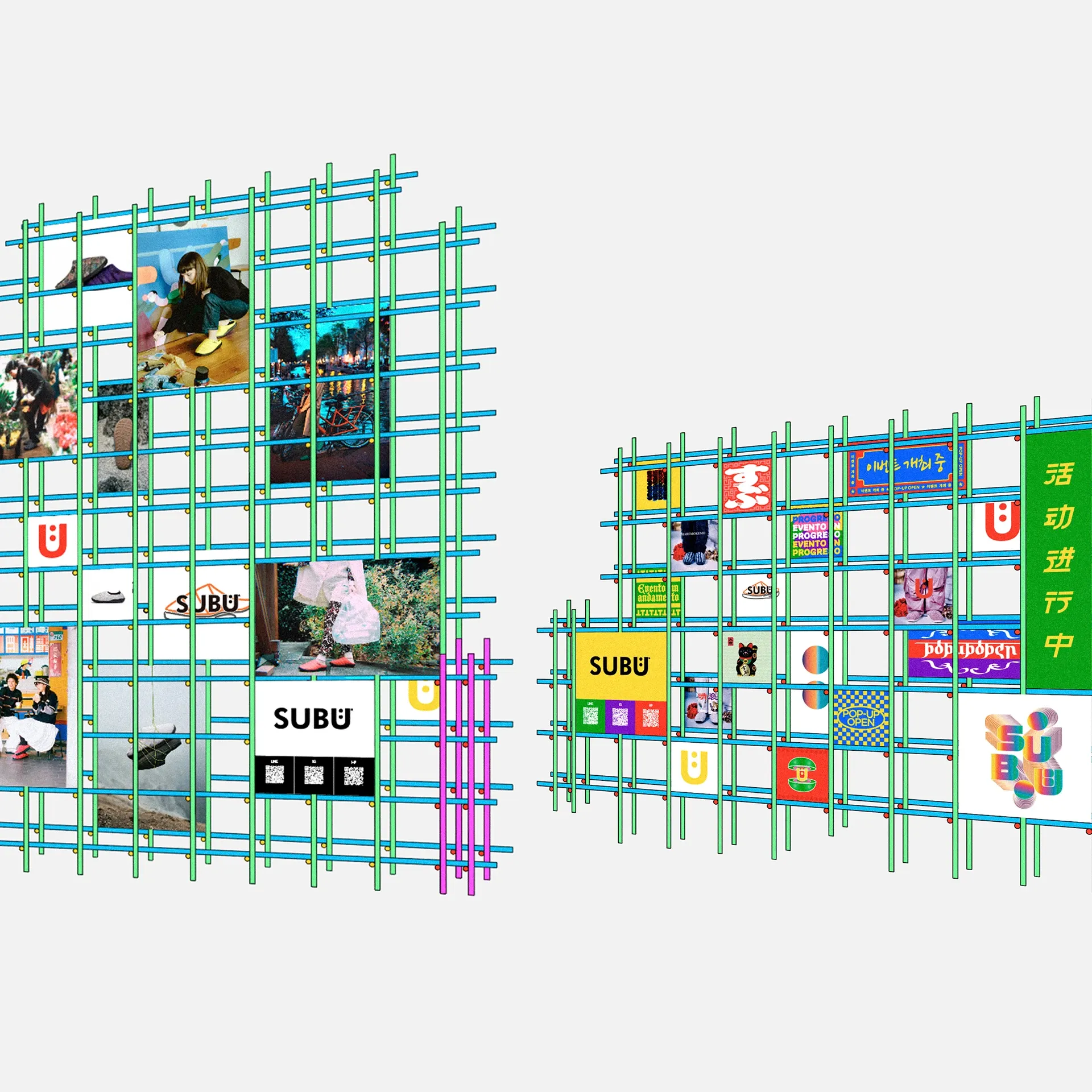 ブランドのヒストリーをディレクター府川俊彦氏自身の手によりコラージュで振り返る展示や 70タイプ以上のプロダクトを購入できるショップを併設し、SUBUの世界観を余す事なく体感できるポップアップとなった。